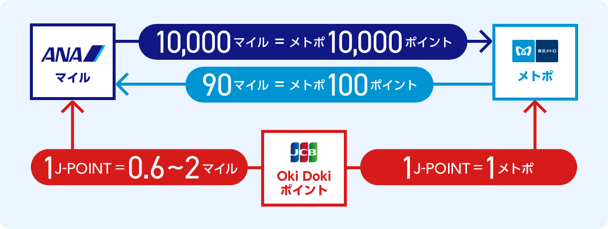 日々のお買い物やPASMOのオートチャージで貯まったJCBカードのポイント(Okidokiポイント)をマイルやメトポに移行できます。